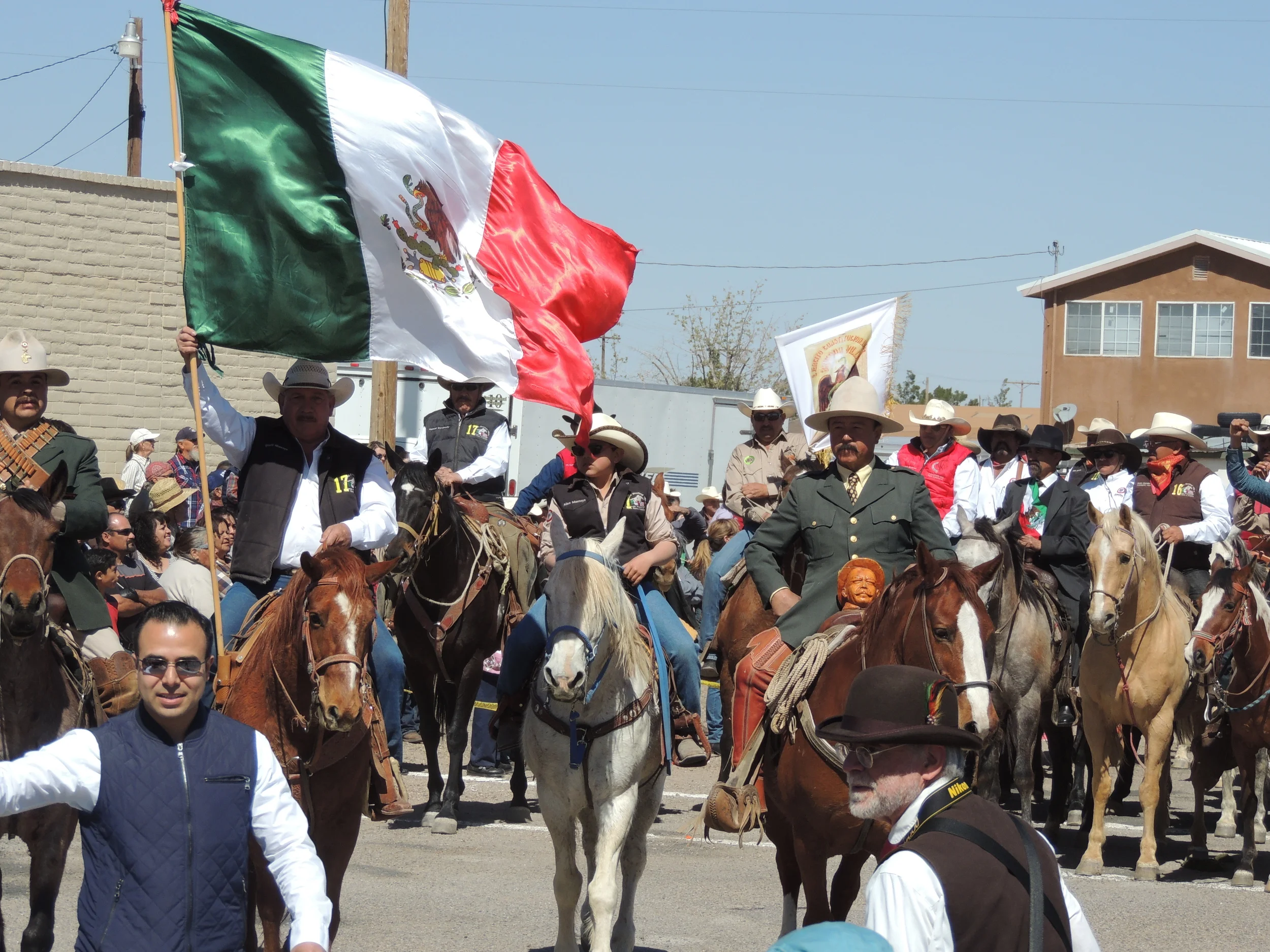 The little hamlet of Columbus, New Mexico, thirty odd miles from Deming and three miles from the Mexican village of Palomas buzzled yesterday with reenactors, celebrities, historians, military history buffs, TV, newspaper and film crews. Over 2,000 people from all walks of life came to commemorate a momentous event that happened just over 100 years ago. A group of one hundred Villista reenactors on horseback met at the border with reenactors of the U.S. Cavalry and rode into Columbus to throngs of cheering spectators. The granddaughter of General George S. Patton, who received his first combat experience in the Punitive Expedition as a second lieutenant and aide to General John J. "Blackjack" Pershing, greeted the crowds. Helen Patton read a letter from Sandra Pershing before the sang "America the Beautiful" and paid respect during the Mexican national anthem. A great great grandson of Pancho Villa in a show of friendship and peace between the United States and Mexico, shook hands and hugged. Mayor Philip Skinner and U.S. representative Steve Pearce posed with Pancho Villa (the reenactor), Helen Patton, Francisco Antonio Villa Alcazar for pictures, briefly joined by Francisco I. Madero (a spitting image of the real president of Mexico).