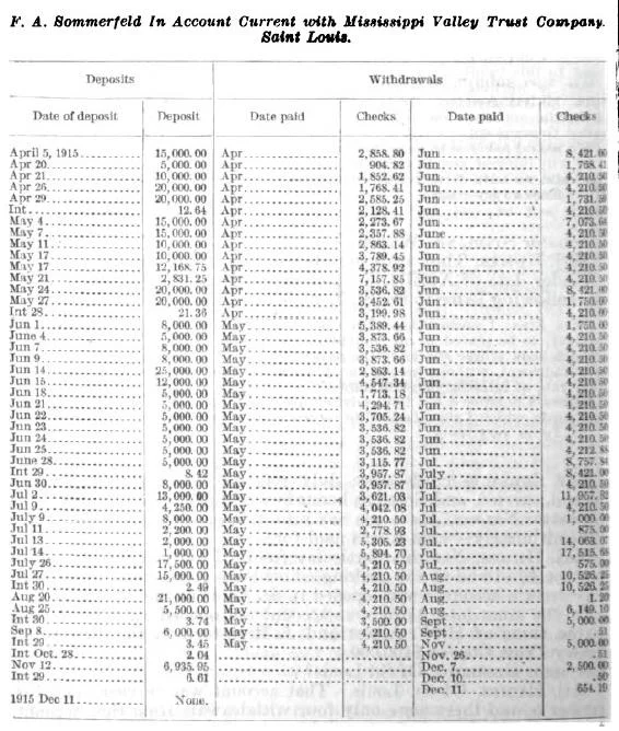 Sommerfeld’s account at the Mississippi Valley Trust Company shows a total $381,000 flowing through it from April to December 1915.